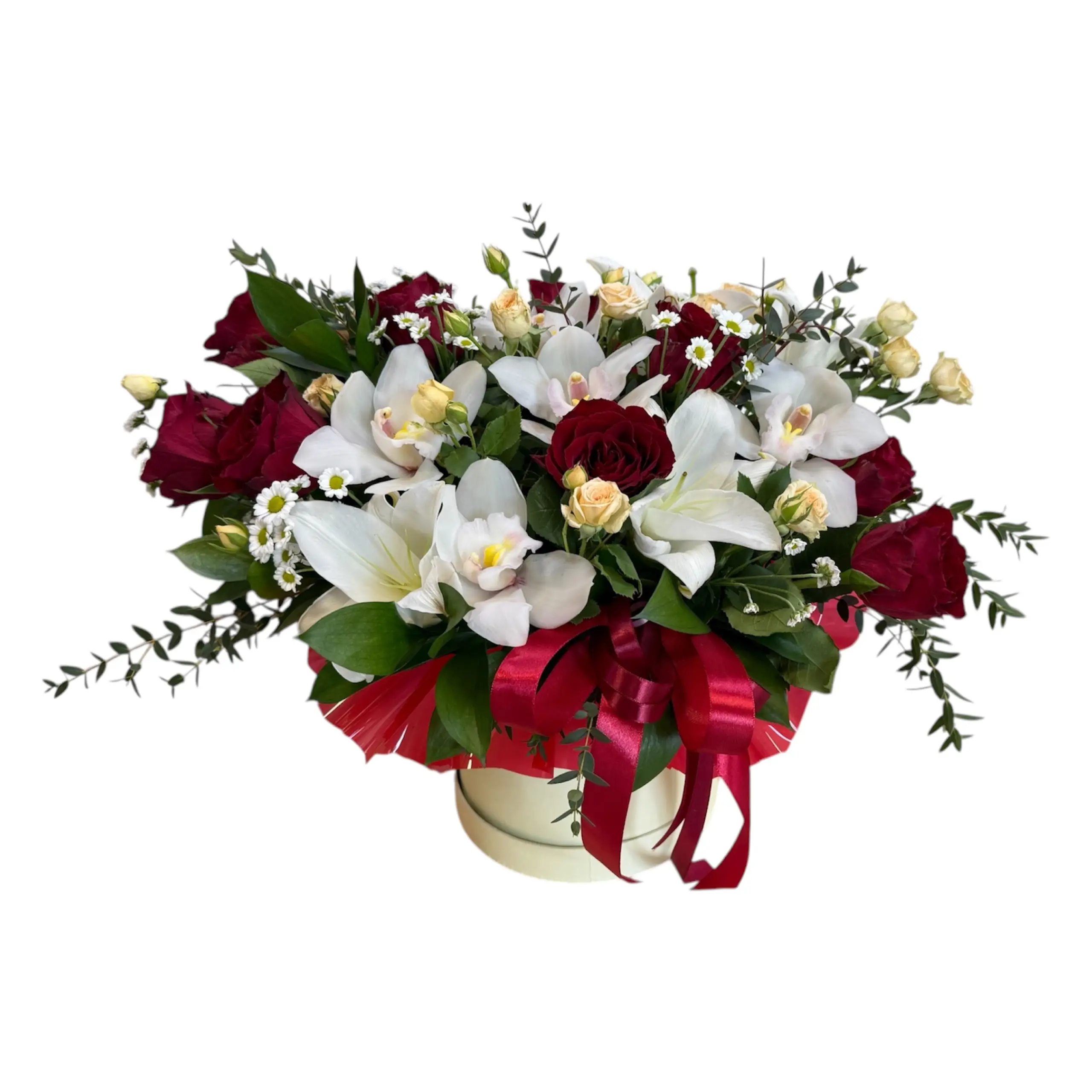 An elegant combination of red roses, white orchids, lilies, and greenery arranged in a stylish box. The composition looks refined and sophisticated, making it a perfect gift for both loved ones and business partners.