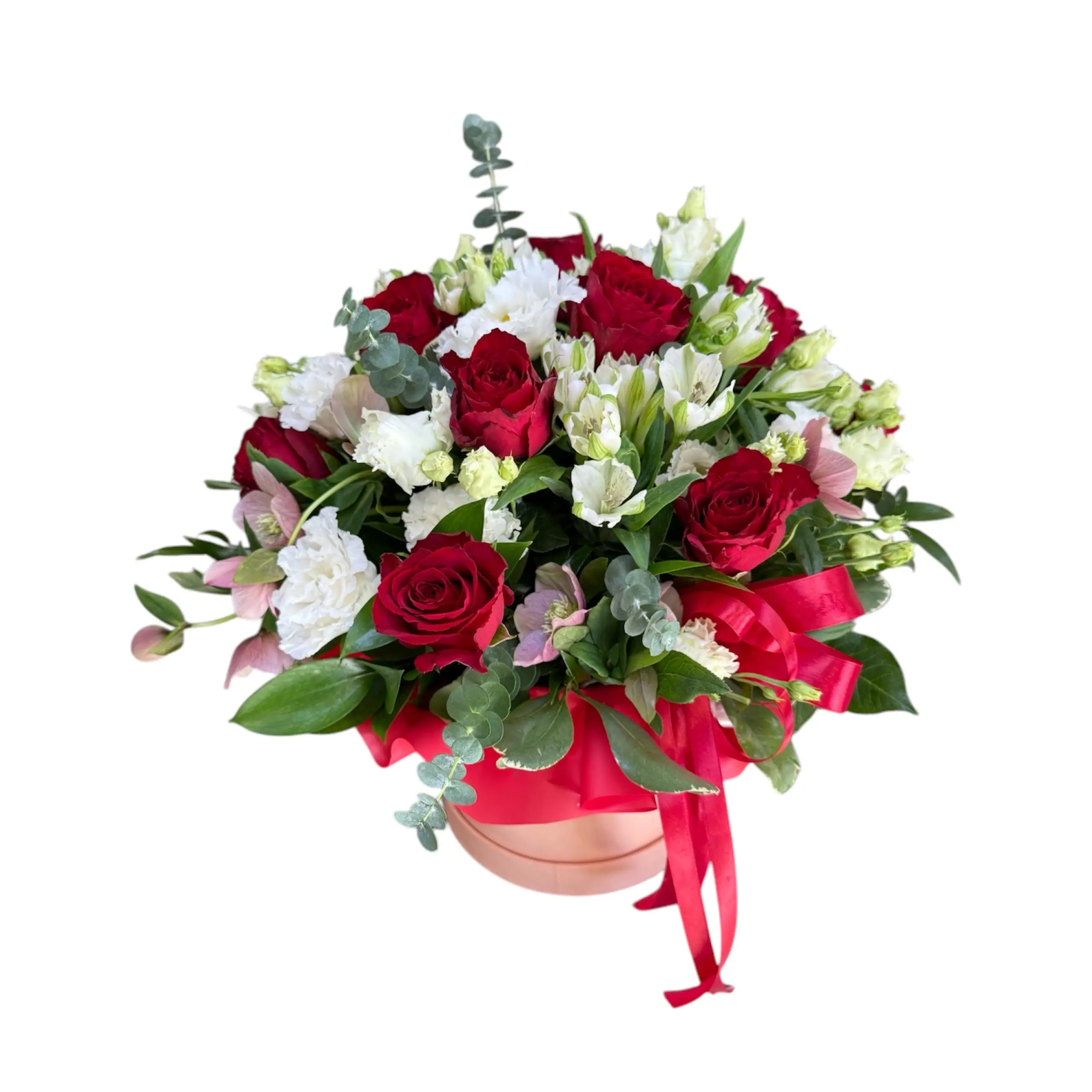 A classic round arrangement featuring red and white flowers in a stylish box. A concise and elegant choice, suitable for both personal occasions and business greetings.
