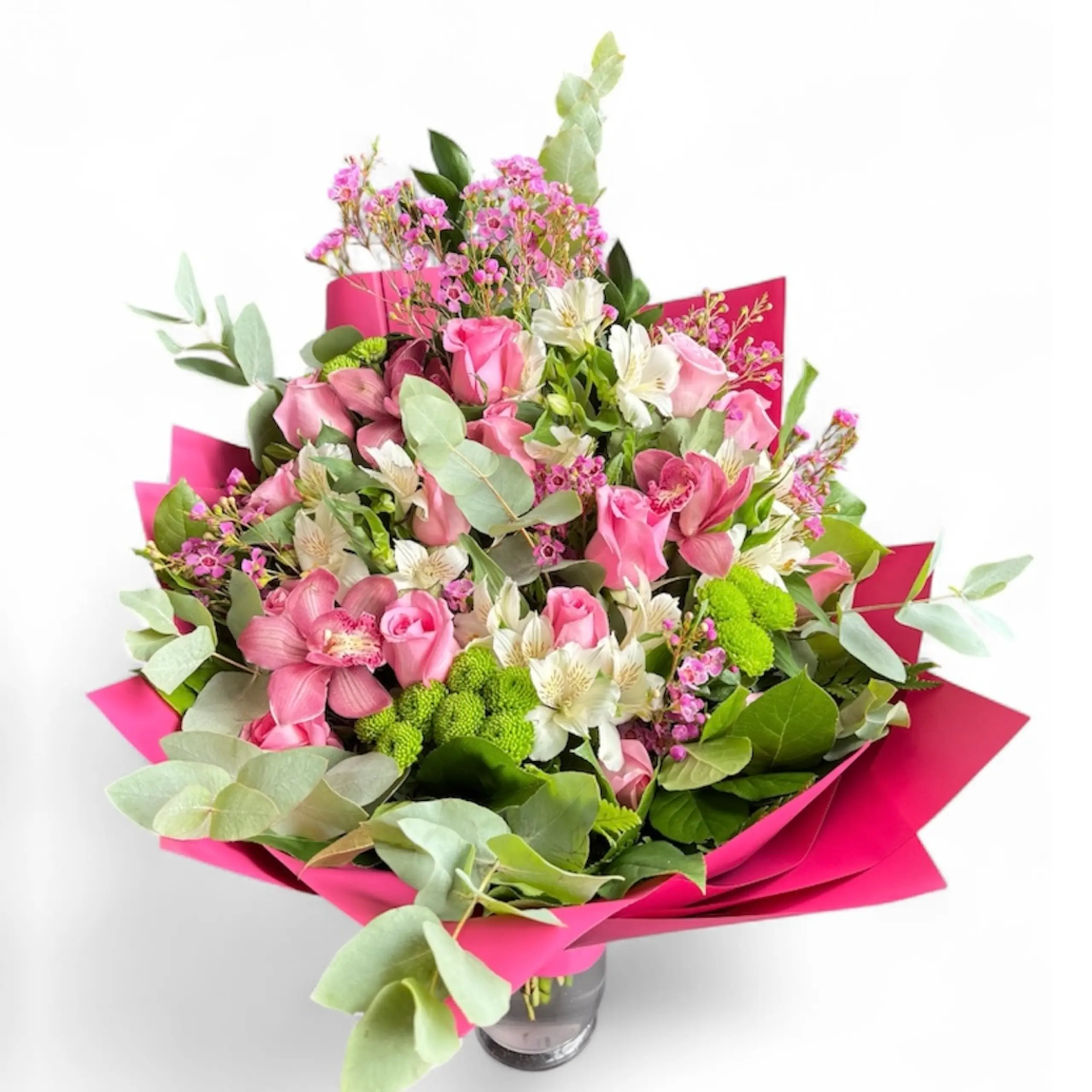 A trendy triangular-shaped bouquet in soft pink and green tones. A bright, stylish, and unique gift that stands out with its original composition and contemporary color palette.