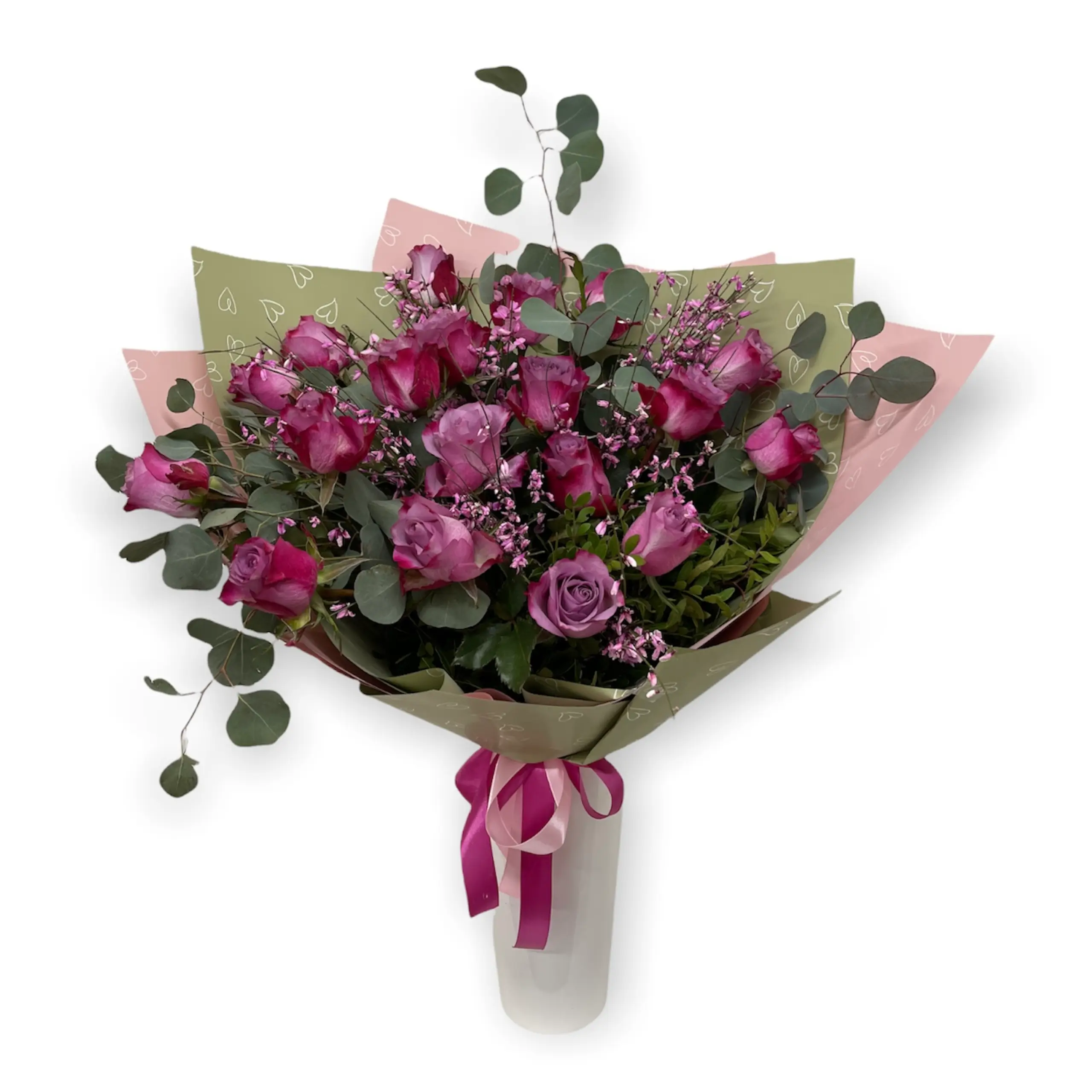 Элегантная композиция в декоративной упаковке. Глубокий оттенок роз символизирует утонченность и загадочность, а свежая зелень подчёркивает их красоту. Идеальный подарок для тех, кто ценит изысканность и стиль.